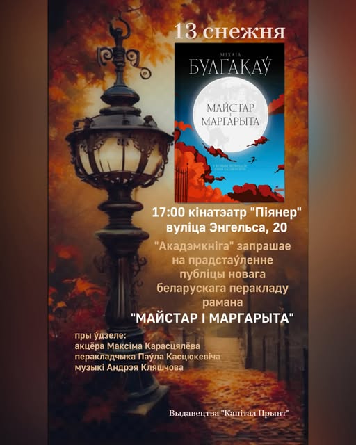 У суботу, 13 снежня, у кінатэатры "Піянер" адбудзецца прэзентацыя новага беларускага перакладу рамана Міхаіла Булгакава «Майстар і Маргарыта».