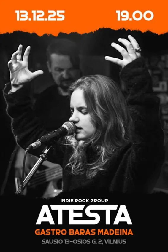 13 снежня ў Вільні з прэзентацыяй новага альбома выступіць гурт ATESTA – выканаўцы культавых песень „Белы“, „+375“ і „Ажыны“.