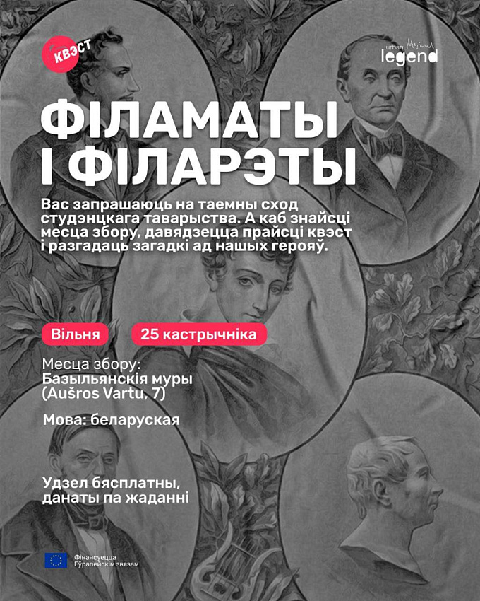 Прайдзіце гарадскі квэст ад ULegend, сустрэньцеся з Філаматамі і Філарэтамі і іх настаўнікамі, наведайце віленскія адрасы, звязаныя з іх гісторыяй, і нарэшце дайдзіце да месца таемнага сходу, дзе а 16:00 адбудзецца філамацкая вечарынка.