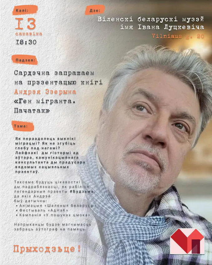 У наступную пятніцу, 13 сакавіка, у Віленскім беларускім музеі імя Луцкевіча адбудзецца прэзентацыя кнігі Андрэя Эзерына «Ген мігранта. Пачатак».