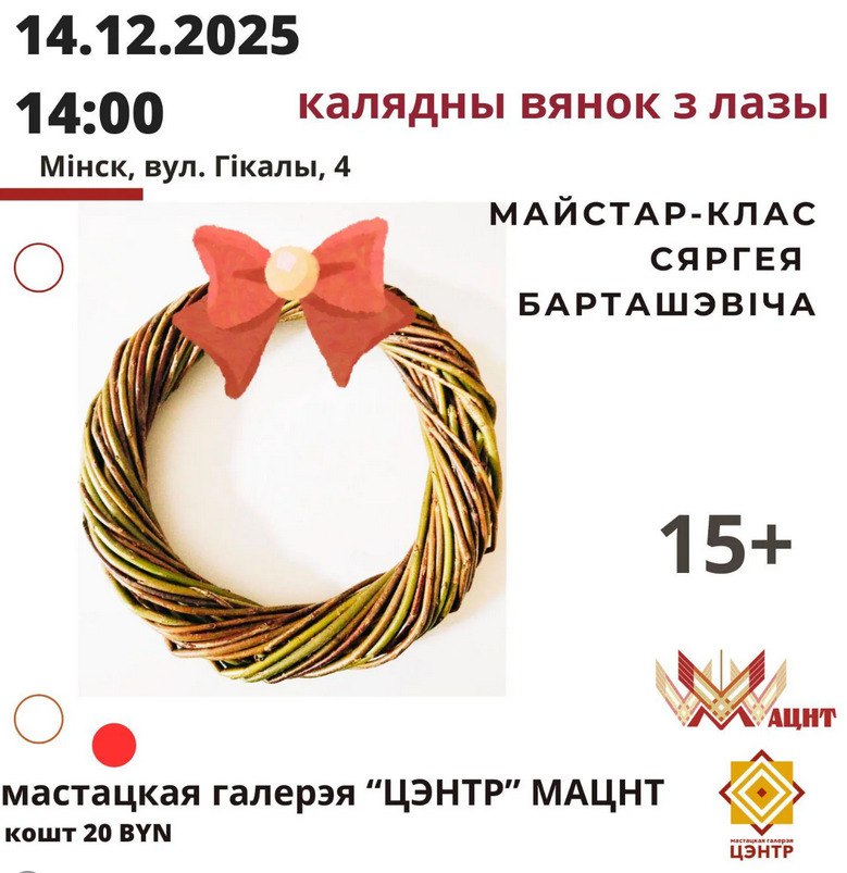 А ў нядзелю, 14 снежня а 14-й, будзе майстар-клас па стварэнні каляднага вянка з натуральных і экалагічных матэрыялаў (15+).