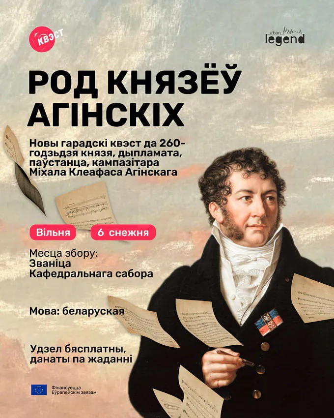 У суботу, 6 снежня, беларусаў Вільні клічуць на гарадскі квэст "Род князёў Агінскіх" да 260-гадовага юбілеб Міхала Клеафаса Агінскага – дыпламата, палітыка, мецэната і аўтара легендарных паланэзаў.