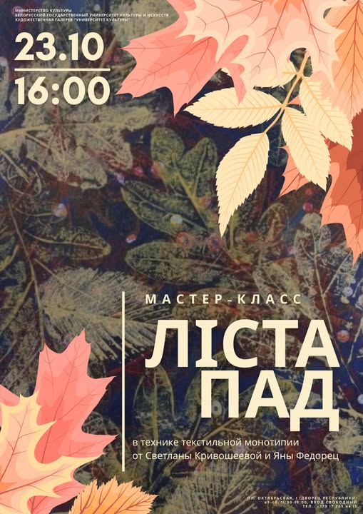 У чацвер, 23 кастрычніка, у галерэі "Універсітэт культуры" адбудзецца майстар-клас па тэкстыльнай манатыпіі "Лістапад".