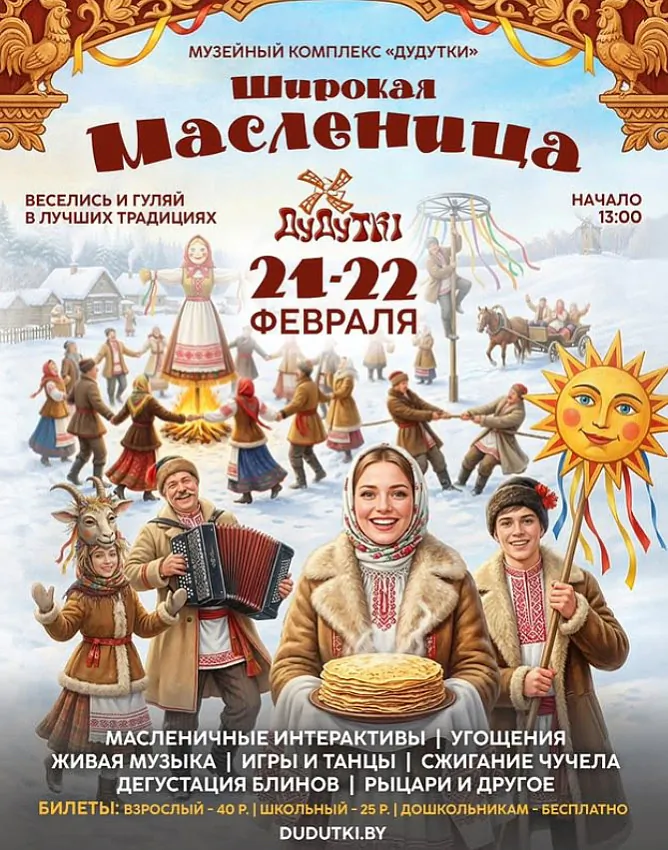 Вас чакаюць масленічныя забавы, смачныя бліны і фірмовы напой, вясёлыя гульні ды танцы, задорныя спевы і інтэрактывы ад гуртоў, годны настрой на ўвесь год.