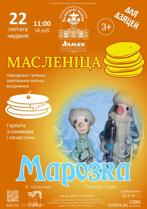 22.02.2026 11:00 - 13:00 тэатр "Лялька" (вул. Пушкіна, 2) 18 рублёў