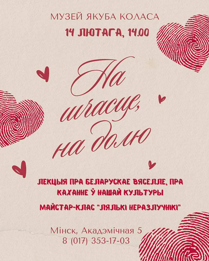 У суботу, 14 лютага, у музеі Якуба Коласа ладзяць валянцінкавы майстар-клас «На шчасце, на долю…», прысвечаны каханню, беларускаму вяселлю і традыцыям сям'і.