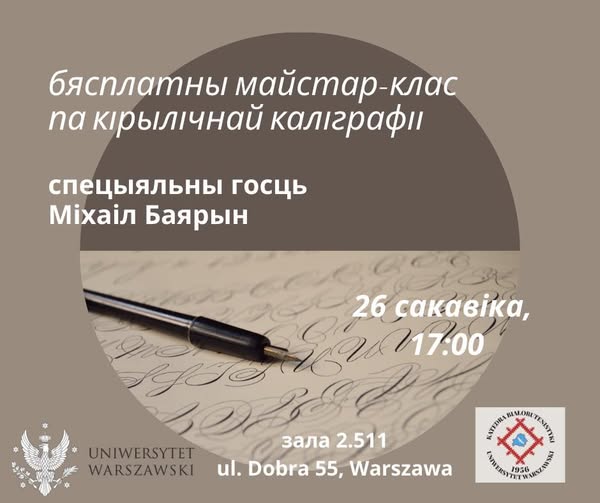 У чацвер, 26 сакавіка, на кафедры беларусістыкі Варшаўскага ўніверсітэта ладзяць майстар-клас па кірылічнай каліграфіі.