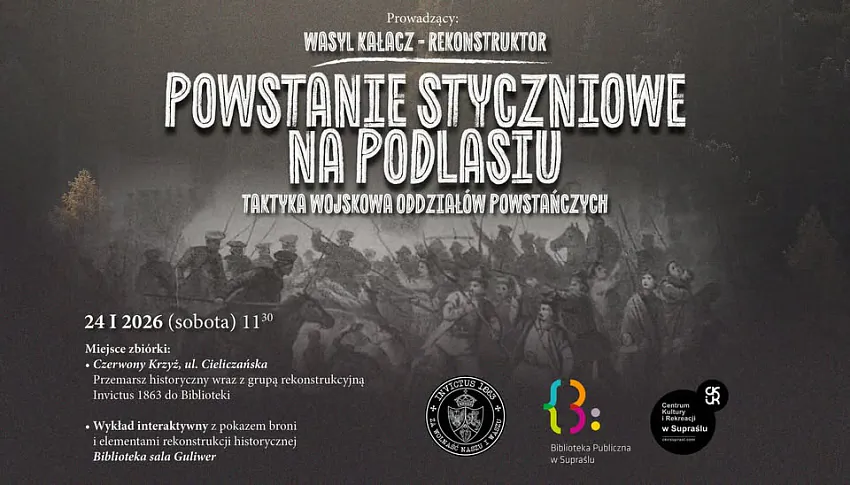 У суботу, 24 студзеня, Васіль Калач з клуба гістарычнай рэканструкцыі INVICTUS чытае ў Супраслі лекцыю пра баявую тактыку падчас Студзеньскага паўстання.