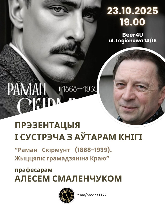 У чацвер, 23 кастрычніка, у Беластоку адбудзецца прэзентацыя кнігі "Раман Скірмунт. Жыццяпіс грамадзяніна Краю" і сустрэча з яе аўтарам, прафесарам Алесем Смаленчуком.