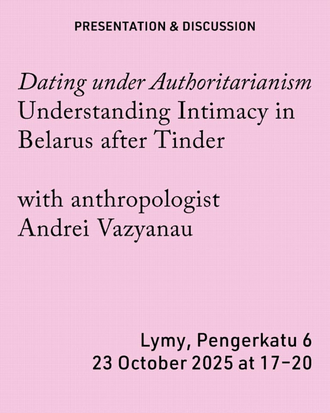 У чацвер, 23 кастрычніка, у Хельсінкі адбудзецца прэзентацыя і дыскусія "Спатканні пры аўтарытарызме: разуменне блізкасці ў Беларусі пасля Tinder" з антраполагам Андрэем Вазянавым.