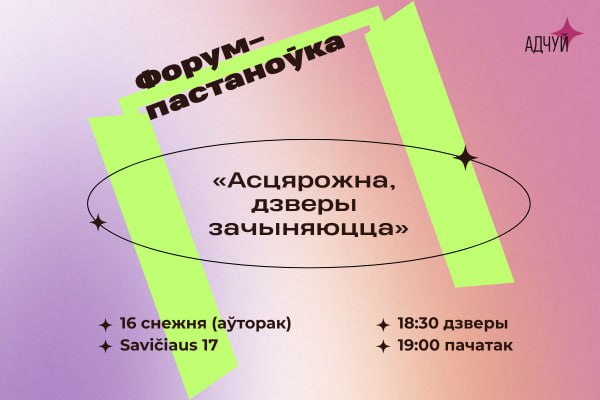 У аўторак, 16 снежня, форум-тэатр "Адчуй" грае ў Еўрапейскім гуманітарным універсітэце адзіны паказ форум-пастаноўкі "Асцярожна, дзверы зачыняюцца", створанай удзельніцамі майстэрні "Жаночыя гісторыі: ад бяссілля да сілы".