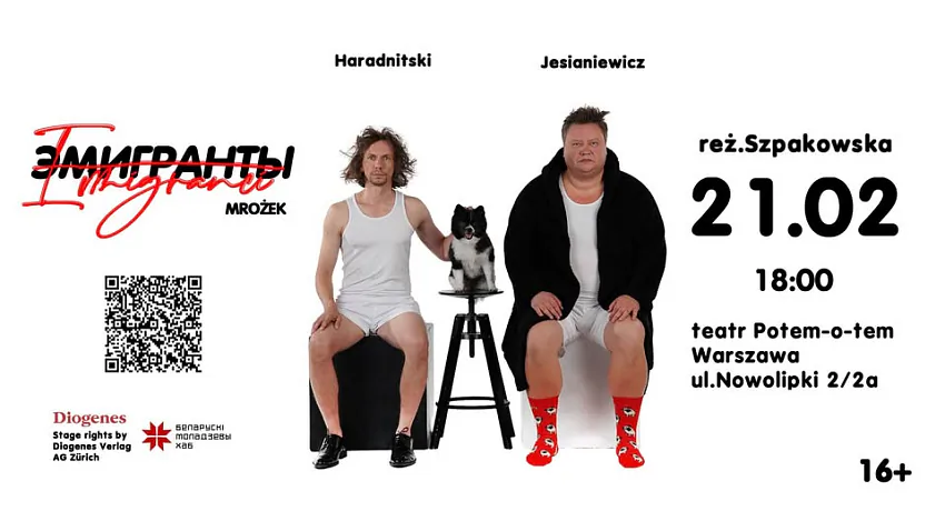 21 лютага, у суботу, у Варшаве граюць спектакль па п'есе Славаміра Мрожака "Эмігранты".