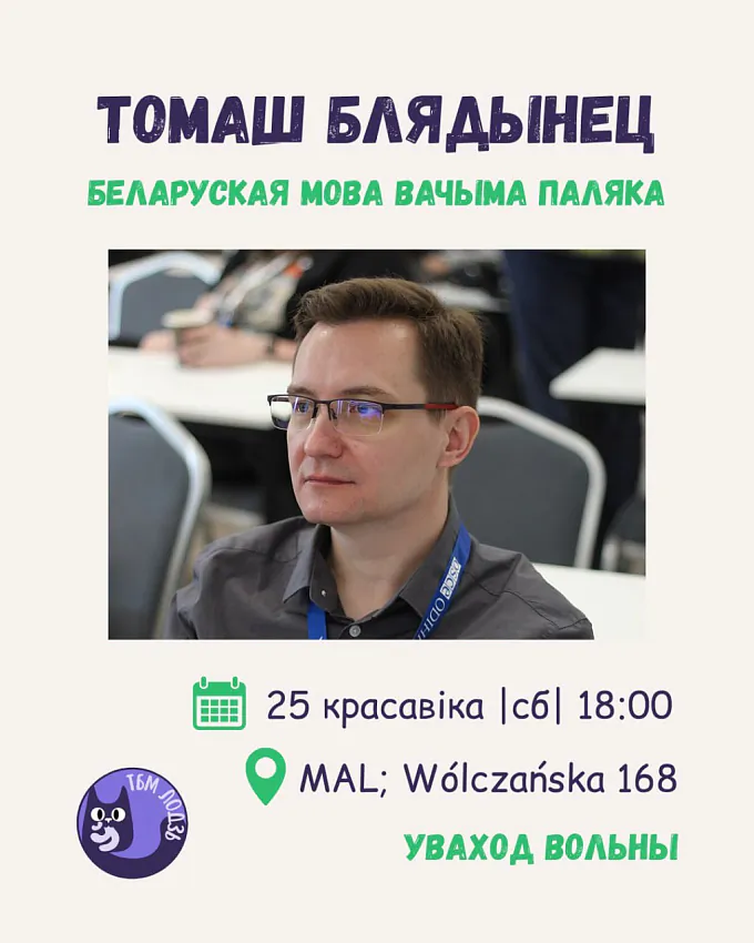 У суботу, 25 красавіка, Таварыства беларускай мовы ў Лодзі запрашае на сустрэчу-размову з Томашам Блядынцом «Беларуская мова вачыма паляка».