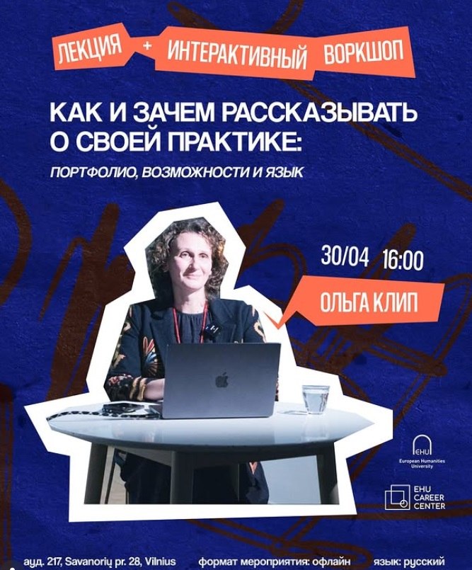 У чацвер, 30 красавіка, у Еўрапейскім гуманітарным універсітэце адбудзецца сустрэча-варкшоп з куратаркай Вольгай Кліп «Як і навошта расказваць пра сваю практыку: партфоліа, магчымасці і мова».