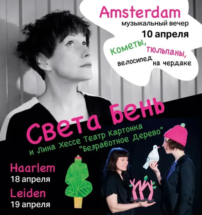У наступную пятніцу, 10 красавіка, Света Бень ладзіць у Амстэрдаме музычна-паэтычны вечар «Каметы, цюльпаны, ровар на гарышчы».