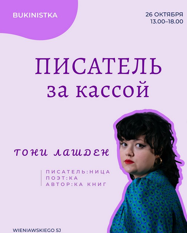 У нядзелю, 26 кастрычніка, у кнігарні "Букіністка" вас будзе чакаць за касай пісьменніца тоні лашдэн.