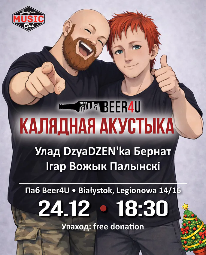 У сераду, 24 снежня, Улад DzyaDZEN'ka Бернат і Ігар Вожык Палынскі граюць у Беластоку калядны акустычны канцэрт.