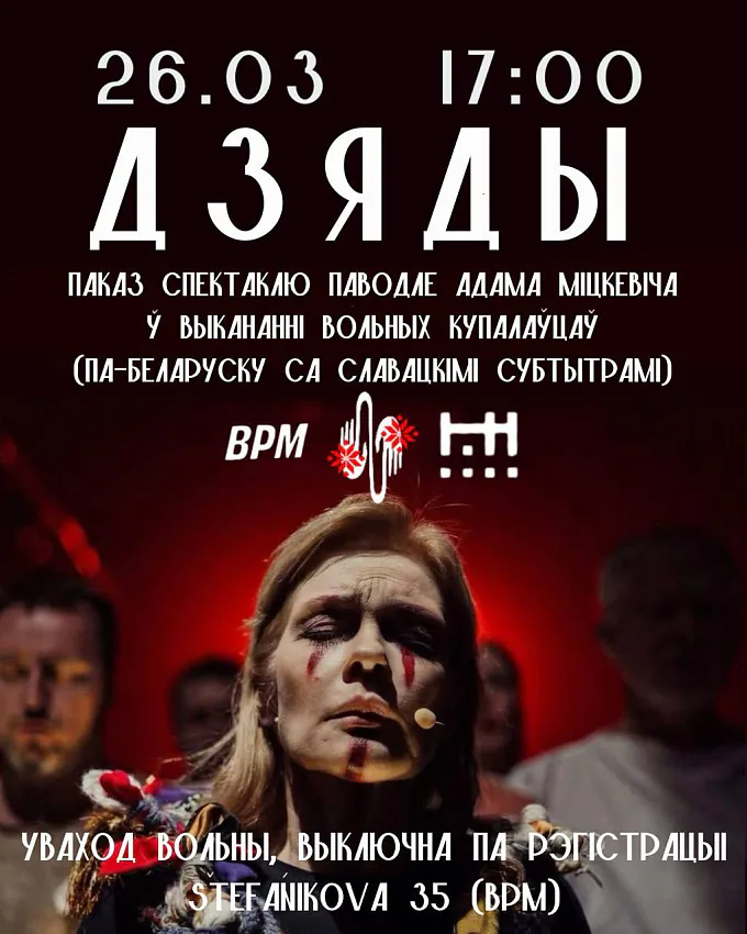 26 сакавіка, у чацвер, у Браціславе ладзяць відэапаказ спектакля Вольных Купалаўцаў «Дзяды» паводле паэмы Адама Міцкевіча.
