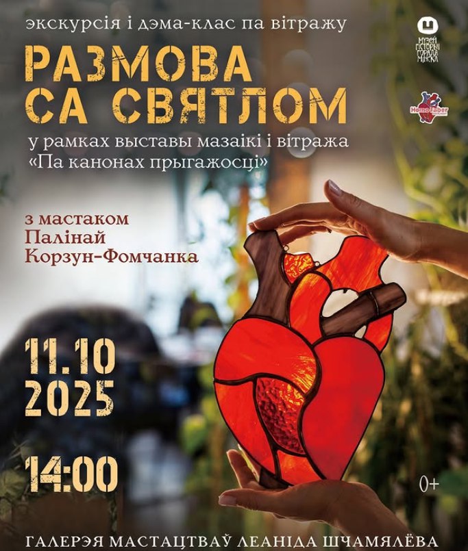 У суботу, 11 кастрычніка, у галерэі Шчамялёва адбудзецца экскурсія і дэма-клас па вітражы "Размова са святлом" з мастачкай, выкладчыцай школы-студыі "HomoFaber" Палінай Корзун-Фомчанка у межах выставы мазаікі і вітража "Па канонах прыгажосці".