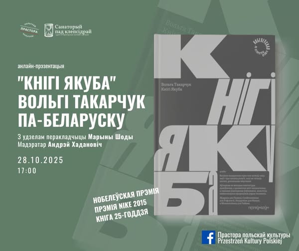 У аўторак, 28 кастрычніка, у межах цыклу “Санаторый пад клепсідрай” ладзяць анлайн-прэзентацыю беларускага перакладу рамана Вольгі Такарчук “Кнігі Якуба” з удзелам перакладчыцы Марыны Шода.