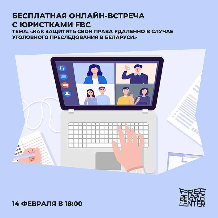 У суботу, 14 лютага, Free Belarus Center ладзіць анлайн-сустрэчу «Як абараніць свае правы дыстанцыйна ў выпадку крымінальнага пераследу ў Беларусі».