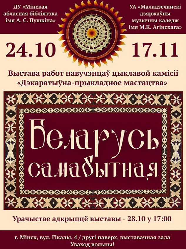 У аўторак, 28 кастрычніка, у пушкінскай бібліятэцы адкрываецца выстава навучэнцаў цыклавой камісіі "Дэкаратыўна-прыкладное мастацтва" Маладзечанскага музычнага каледжа імя Агінскага “Беларусь самабытная”.