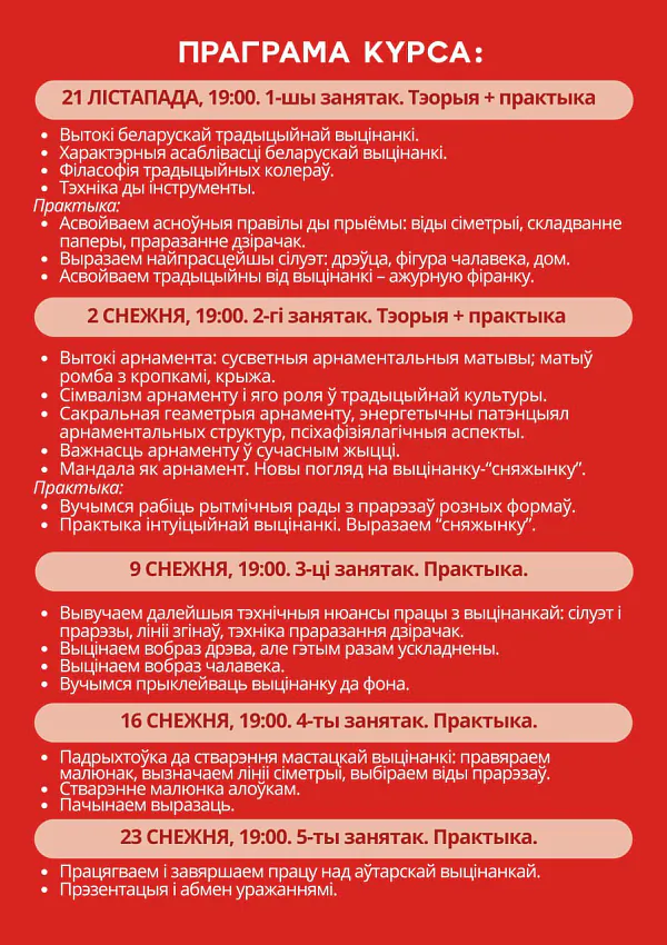 Удзельнікі пазнаёмяцца з гісторыяй беларускай выцінанкі і яе асаблівасцямі, паглыбяцца ў філасофскія і духоўныя аспекты гэтага мастацтва і навучацца вырабляць выцінанкі ўласнаручна.