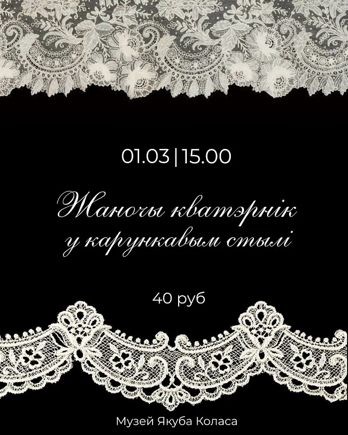 У нядзелю, 1 сакавіка, у музеі Якуба Коласа ладзяць жаночы кватэрнік у карункавым стылі. Бо кожная жанчына, як і завіток карункі, унікальная.