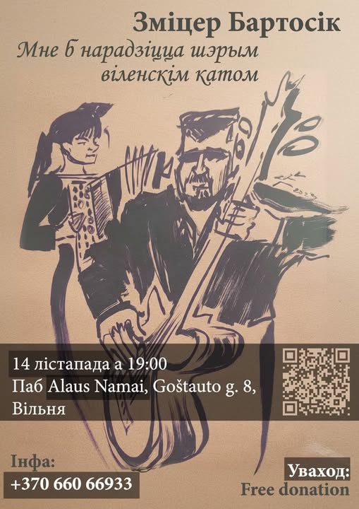 У пятніцу, 14 лістапада, у Вільні граюць канцэрт Зміцер Бартосік і Таццяны Карпіловіч.