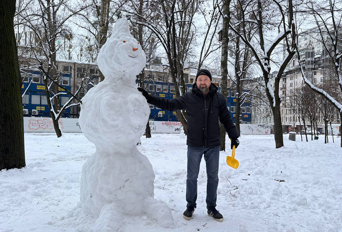 Валера Руселік каля зьлепленае сьнежнае бабы. Варшава, 2026 г. Фота з архіву аўтара