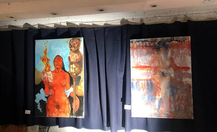 Я выстаўляюся тут, бо мяне запрасіў Яраслаў Кірвель (вядучы фестывалю — рэд. Budzma.org). Я дапамагаў маляваць тут сцены і таксама ўдзельнічаю ў выставе. На маім творы выяўлены Ісус Хрыстос і апостал Пётр — у момант, калі, паводле біблейскай гісторыі, Ісус хадзіў па вадзе і паклікаў Пятра, а апостал засумняваўся і пачаў тануць. Я ў сваёй творчасці звяртаюся да рэлігійнай тэматыкі, бо мне гэта падабаецца — гэта эстэтычна.