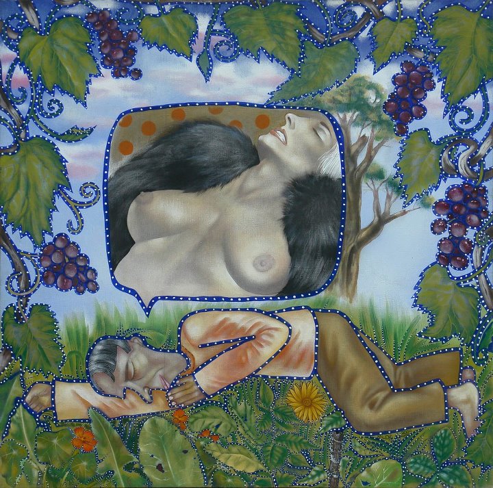 Ад дрымлэнду, на першы погляд, у гэтай працы толькі дрым, але калі ўзяць кантэкст крыху шырэйшым, выйсці за межы таго, што намалявана тут у літаральным сэнсе, дык гэта цэлая краіна і нават свет заклапочаных мужчынаў, якія ўвесь час мараць пра сэкс з прывабнымі жанчынамі. Мастак праводзіць мяжу паміж гэтым уяўным светам, які ён нібы капіюе з сучаснага гламурнага порна (хіба што ў рысах твару жанчыны можна прачытаць элементы аўтарскага змянення шаблону), і камічным светам мужчынаў, якія, уласна, і мараць. Так, агульная манера пісаць у мастака такая, што адназначна сцвярджаць, нібы гэты мужчына – клоўн, варты спагады, неяк не выпадае, нельга тут прачытаць здзеку мастака з яго нягегласці, аднак на гендарным ландшафце гэтай карціны добра праступае сатырычнае.
