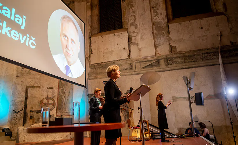Марына Адамовіч на ўручэнні прэміі ў прасторы Pražská křižovatka. Фота: Павал Хадзінскі для Budzma.org