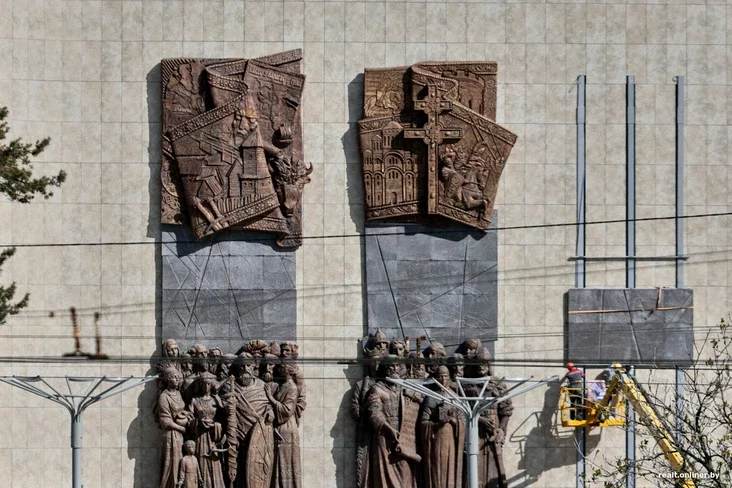 На фасадзе новага гістарычнага музея на вуліцы Арлоўскай у Мінску з’явіцца адразу шэсць гарэльефаў. Свае месцы пакуль занялі толькі два. Трэці — у працэсе мантажу. Вышыня гарэльефаў — 17 метраў, піша Onliner.by (пераклад — «Наша Ніва»).