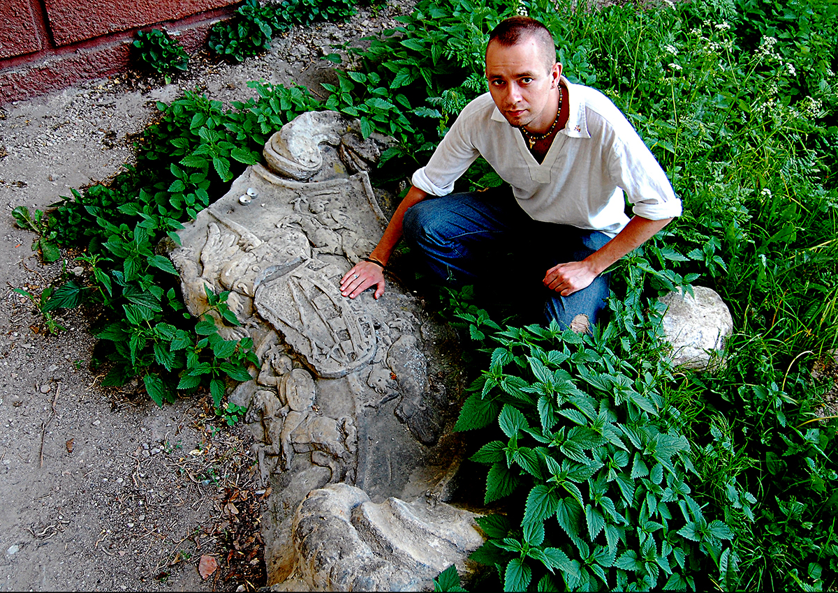 Валера Руселік каля каменнага герба Рэчы Паспалітае, які доўгі час валяўся як непатрэбшчына каля Старога замка ў Горадні, 2008 г. Фота з архіву аўтара