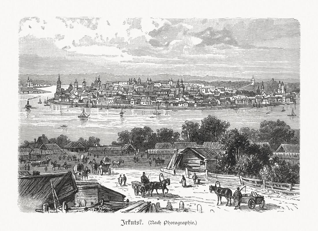 Іркуцк у XIX стагоддзі — адзін з цэнтраў сібірскай ссылкі, куды накіроўвалі ўдзельнікаў паўстання 1863–1864 гадоў (гравюра паводле фатаграфіі). Крыніца: Wikimedia Commons, public domain