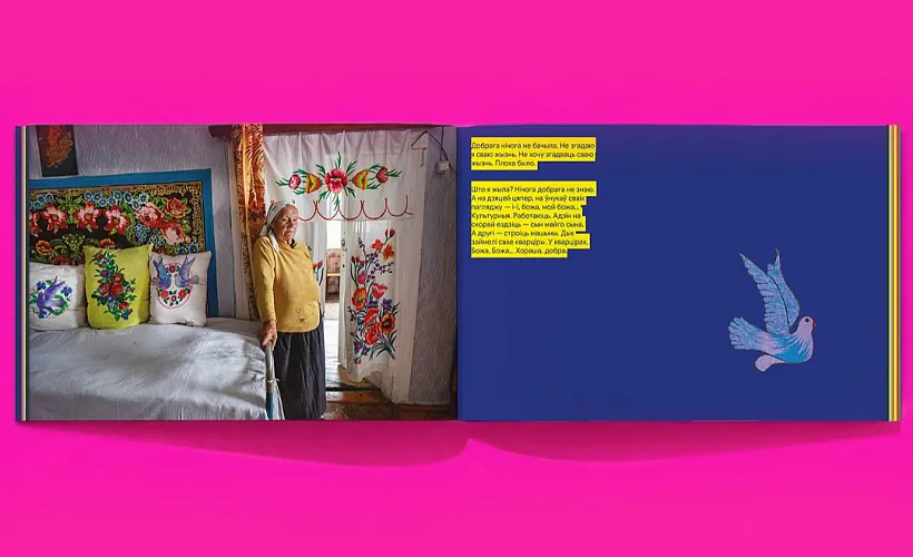 «Гэта гісторыя 80-гадовага Дзеда Касмача з-пад Валожына, які вылечыўся свянцонай вадой і малітвамі, у часы СССР, калі вера была пад забаронай; і знакамітай на ўвесь свет Бабы Каці (Кацярыны Аляксееўны Панчэні) з вёскі Пагост пра яе лёс і хату-музей, якая зрабіла для традыцыйнай культуры так шмат, і зведала столькі гора праз смерць сыноў; гэта і расповяды сясцёр Веры (якая не ходзіць) і глуханямой Мані Нікановіч, якія ўсё жыццё пражылі разамі і не зведалі кахання; і гісторыя 90-гадовай Нелі Міхнавец, закаханай у галубоў настолькі, што вышыла іх, напэўна, з 50 розных варыянтаў; і замовы шаптухі Веры Якаўлеўны Царыкевіч, якая лячыла шэптам нават дактароў і ад рожы, і ад укусу змяі; і маладая сям’я Шацёр, якая ў вясковай хаце пад Маладзечна сабрала адну з самых вялікіх калекцый посцілак і вышавання; і ўжо памерлая Алена Мікітаўна Музычэнка, якая жыла без святла і камунікацый у Чарнобыльскай вёсцы Барталамееўцы, куды вярнулася пасля адсялення ў гарадскую кватэру.