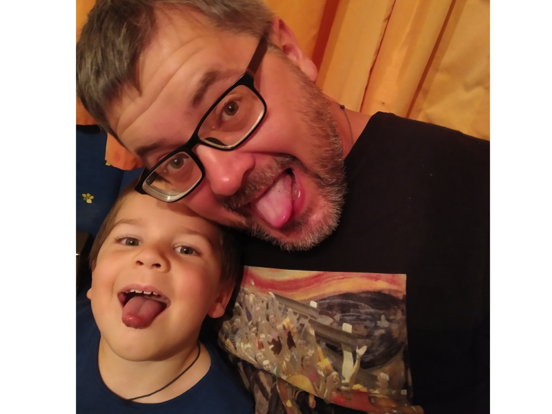 Сяргей Прылуцкі з сынам Адамам падчас акупацыі ў Бучы. Фота з архіву Сяргея Прылуцкага
