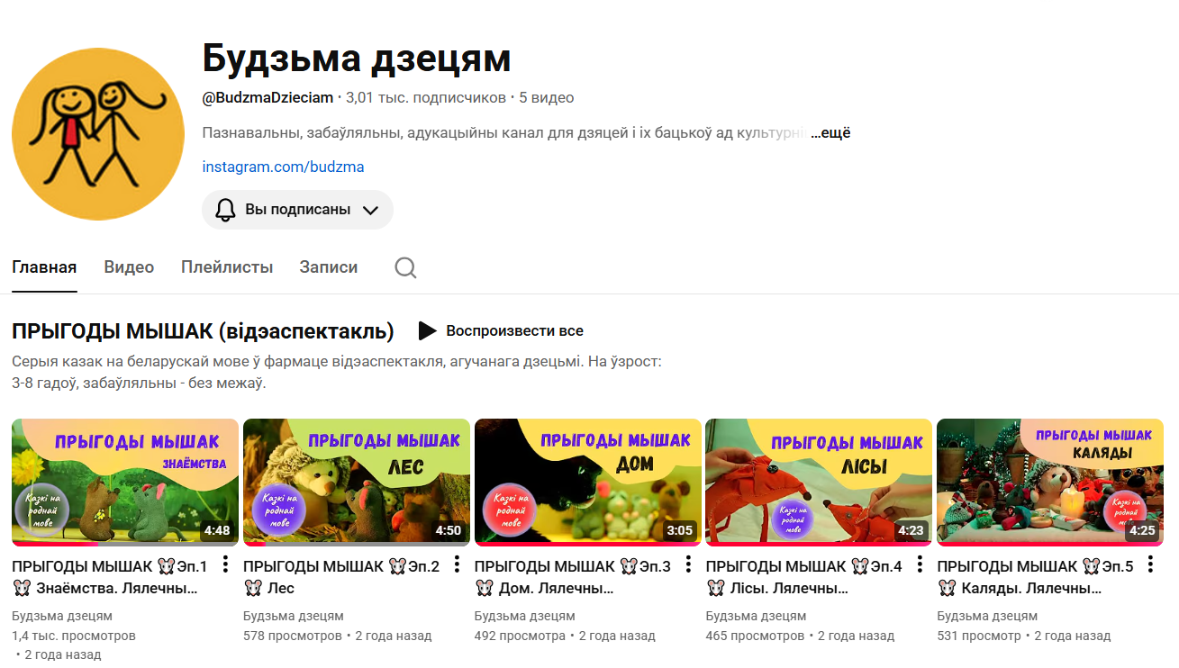 У Беларусі прызналі «экстрэмісцкім» YouTube-канал «Будзьма дзецям» з беларускамоўнымі дзіцячымі казкамі. Адпаведнае рашэнне было прынятае судом Пружанскага раёна 29 кастрычніка.