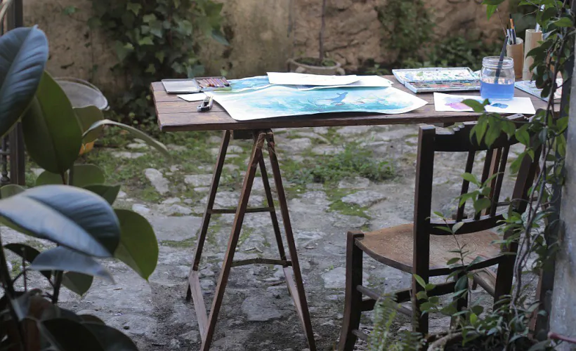 Ад невялікай горнай ракі ідзе меладычны гук, у доме — камін і вялікі стол для керамікі, стол меншага памеру прызначаны для малюнкаў, а ў асобным пакоі мастачка вырабляе скульптуры—коканы для свайго апошняга праекта.